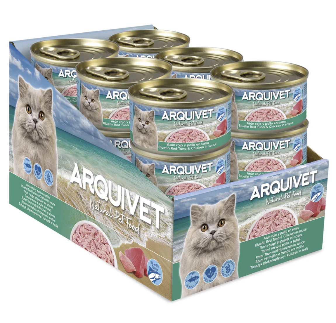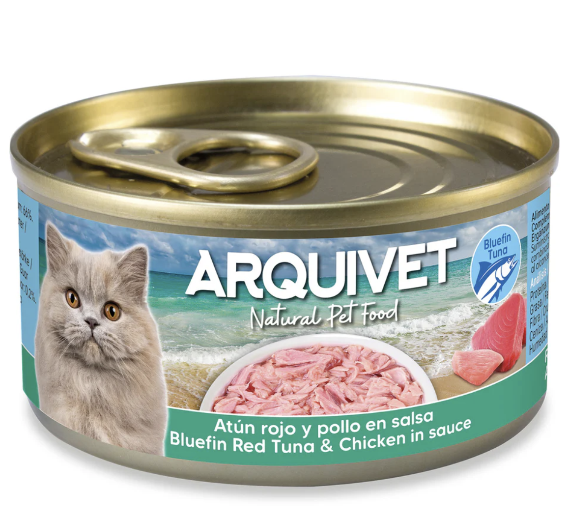 Canned bluefin tuna and chicken in sauce. Tasty and nutritious complementary food that provides cats with essential fluids for kidney function. High-quality, natural ingredients. Grain-free and gluten-free.