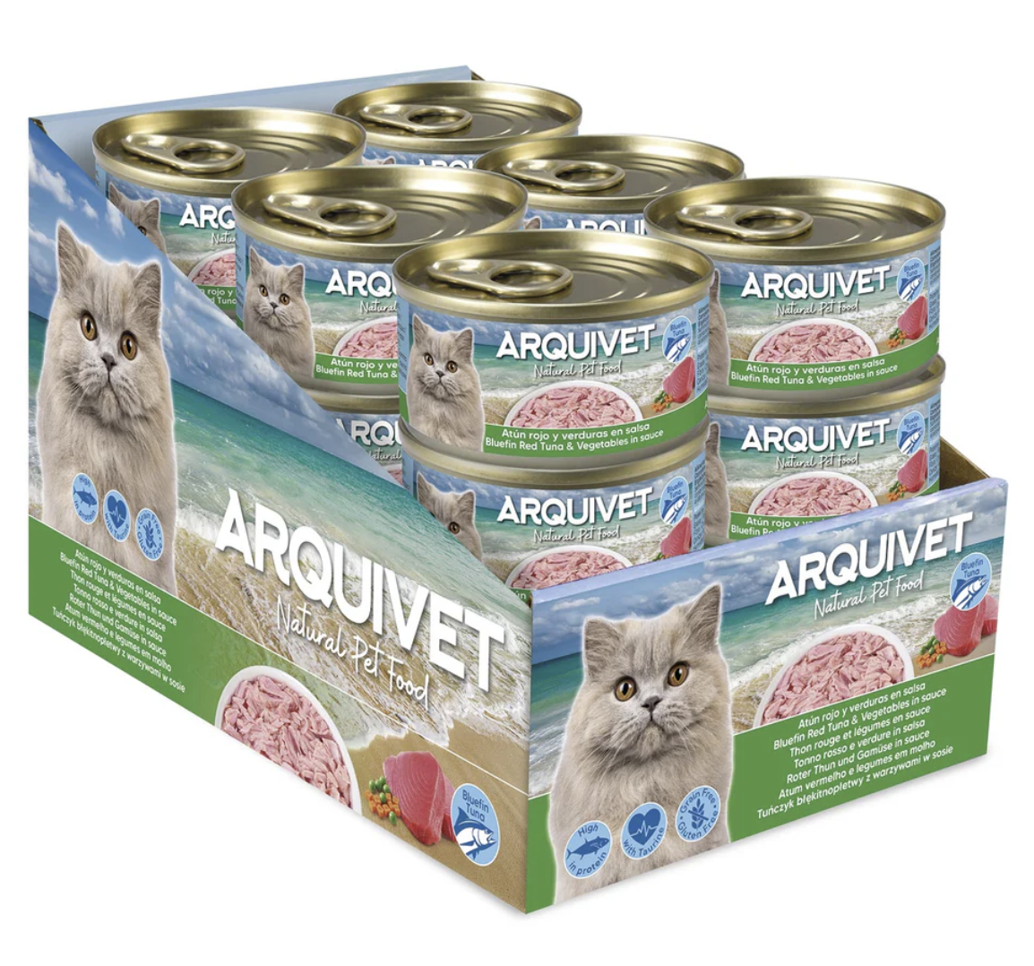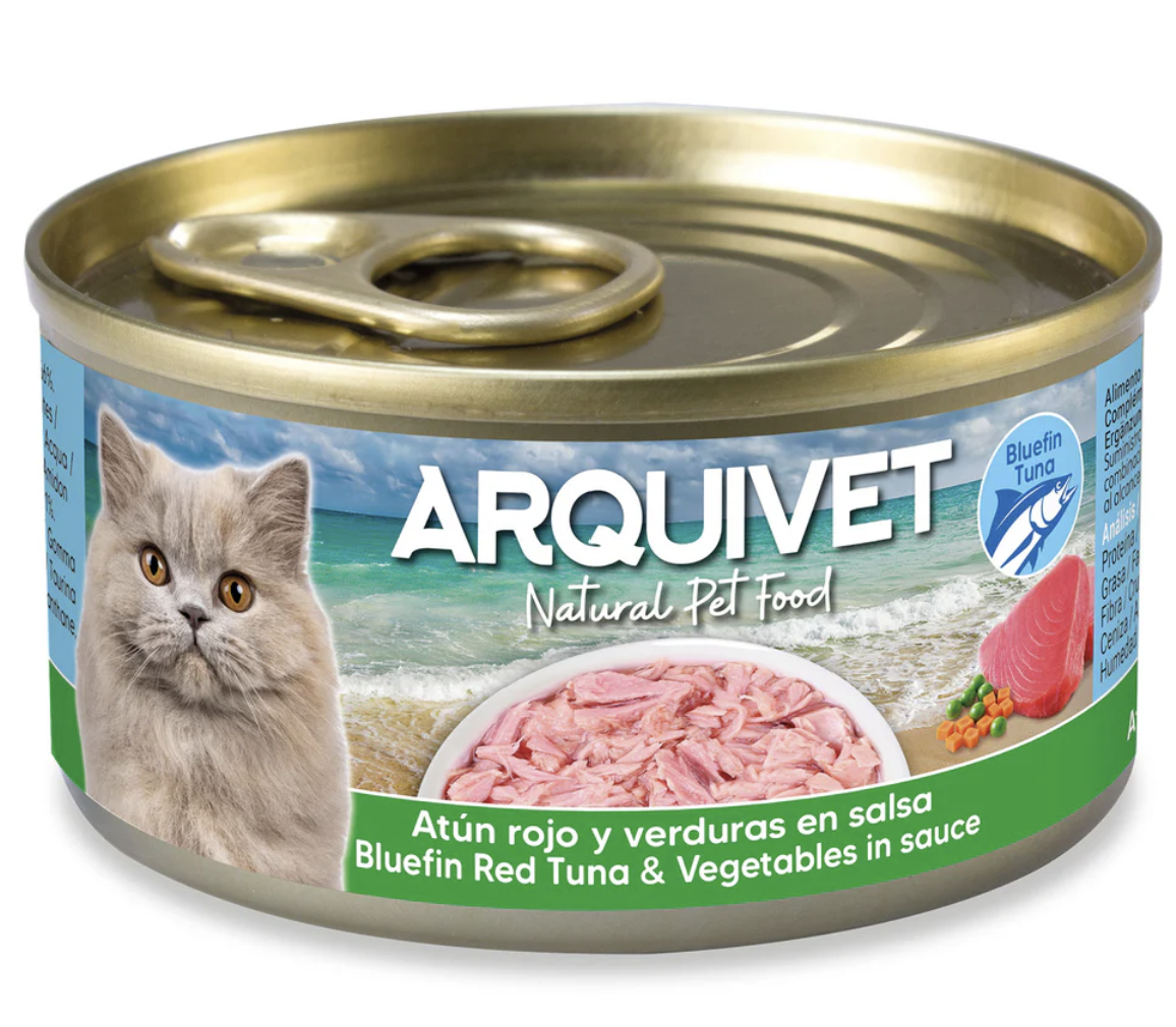 Canned bluefin tuna and vegetables in sauce. Tasty and nutritious complementary food that provides cats with essential fluids for proper kidney function. High-quality, natural ingredients. Grain-free and gluten-free.