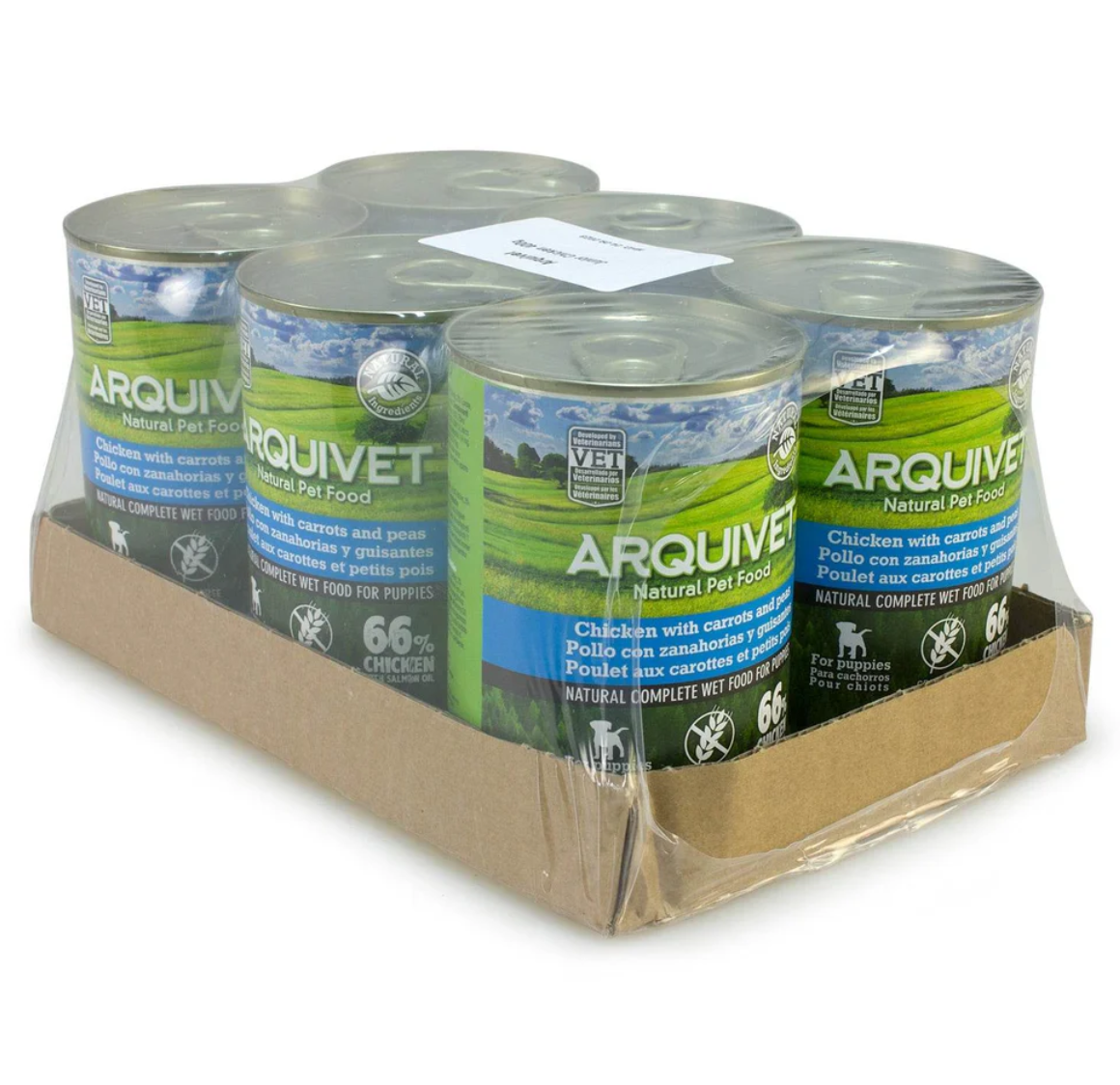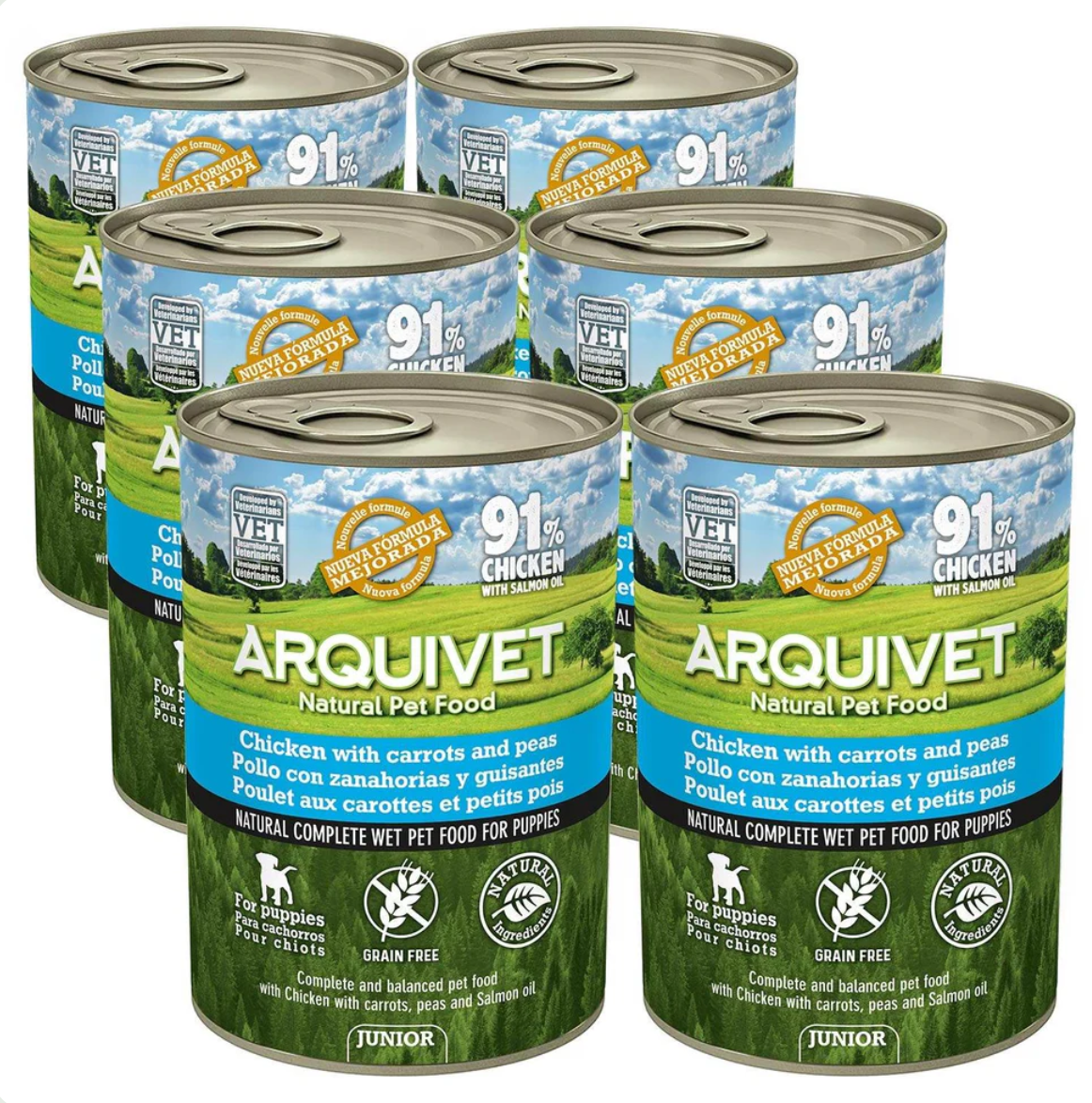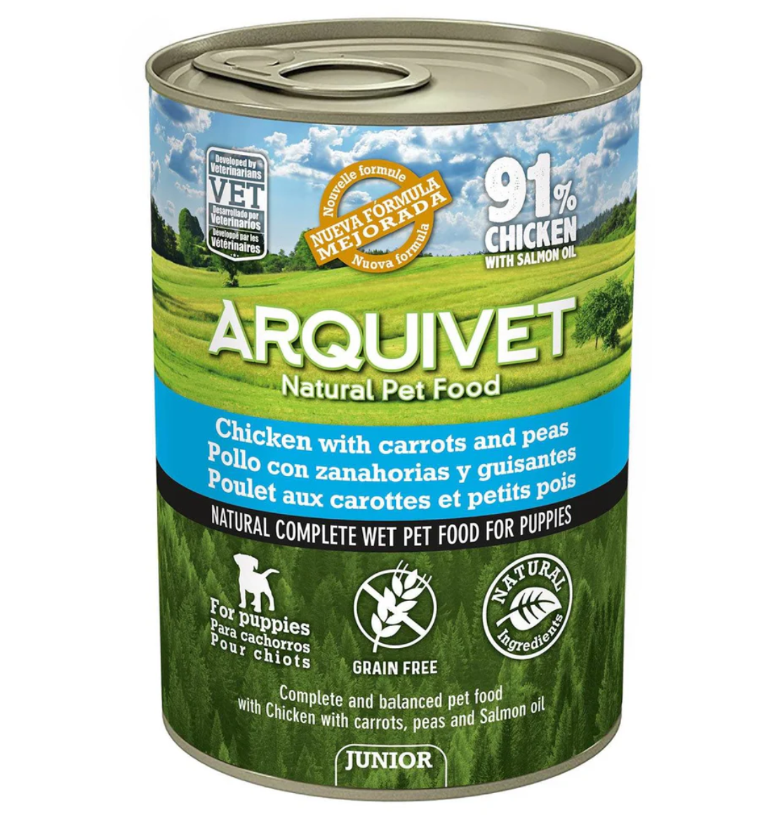 Complete wet food for puppies and junior dogs. Chicken-based with carrots, peas, and salmon oil. 100% natural ingredients. Nutritionally balanced recipes formulated by veterinarians and nutritionists. Slow-cooked to preserve all nutrients. A super-premium food with 91% meat. No artificial colors, preservatives, or flavors. Grain-free. No processed meat or bone meal.