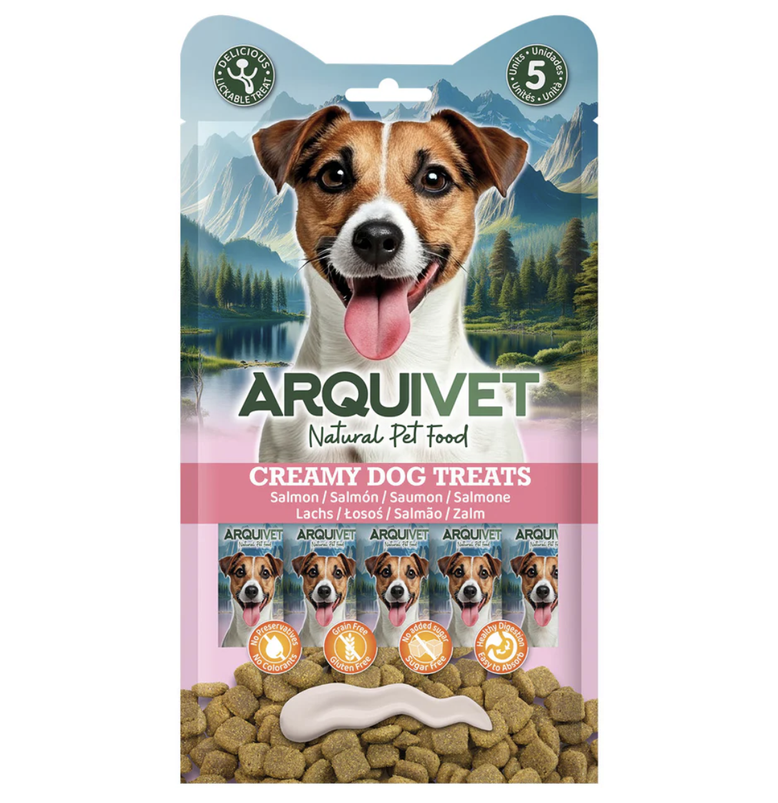 Creamy Dog Treats. A creamy salmon-based dog treat. Easily absorbed, it helps support healthy digestion. Grain-free, gluten-free, and free of artificial colors, preservatives, or added sugar. Its soft and tasty texture is perfect for use as a snack, topping on their meal, or even for training. It’s also enriched with taurine and vitamins to support their health, and comes in a very light recipe: low in fat and high in protein.
