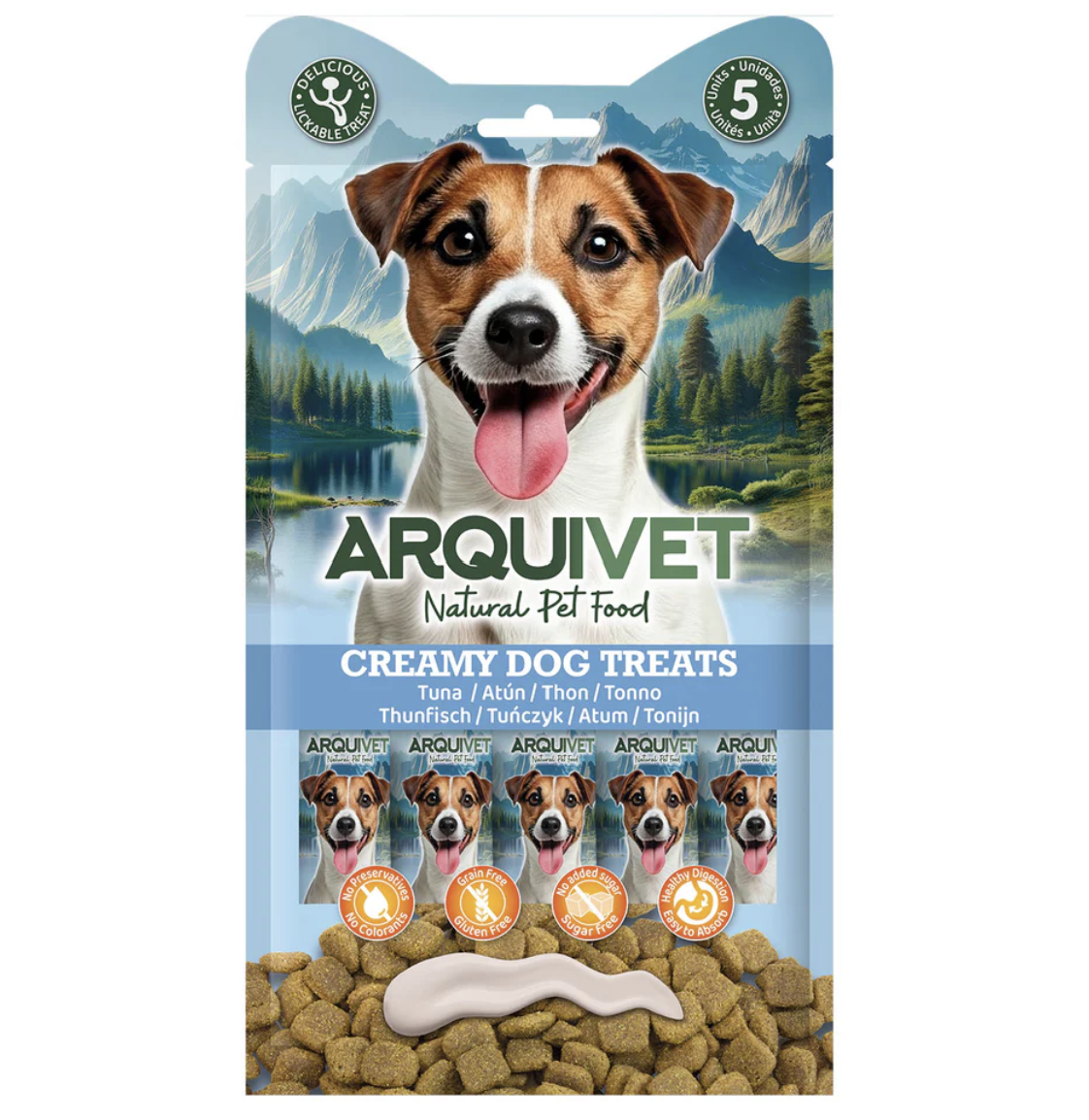 Creamy Dog Treats. A creamy tuna-based dog treat. Easily absorbed, it helps support healthy digestion. Grain-free, gluten-free, and free of artificial colors, preservatives, or added sugar. Its soft and tasty texture is perfect for use as a snack, topping on their meal, or even for training. It’s also enriched with taurine and vitamins to support their health, and comes in a very light recipe: low in fat and high in protein.