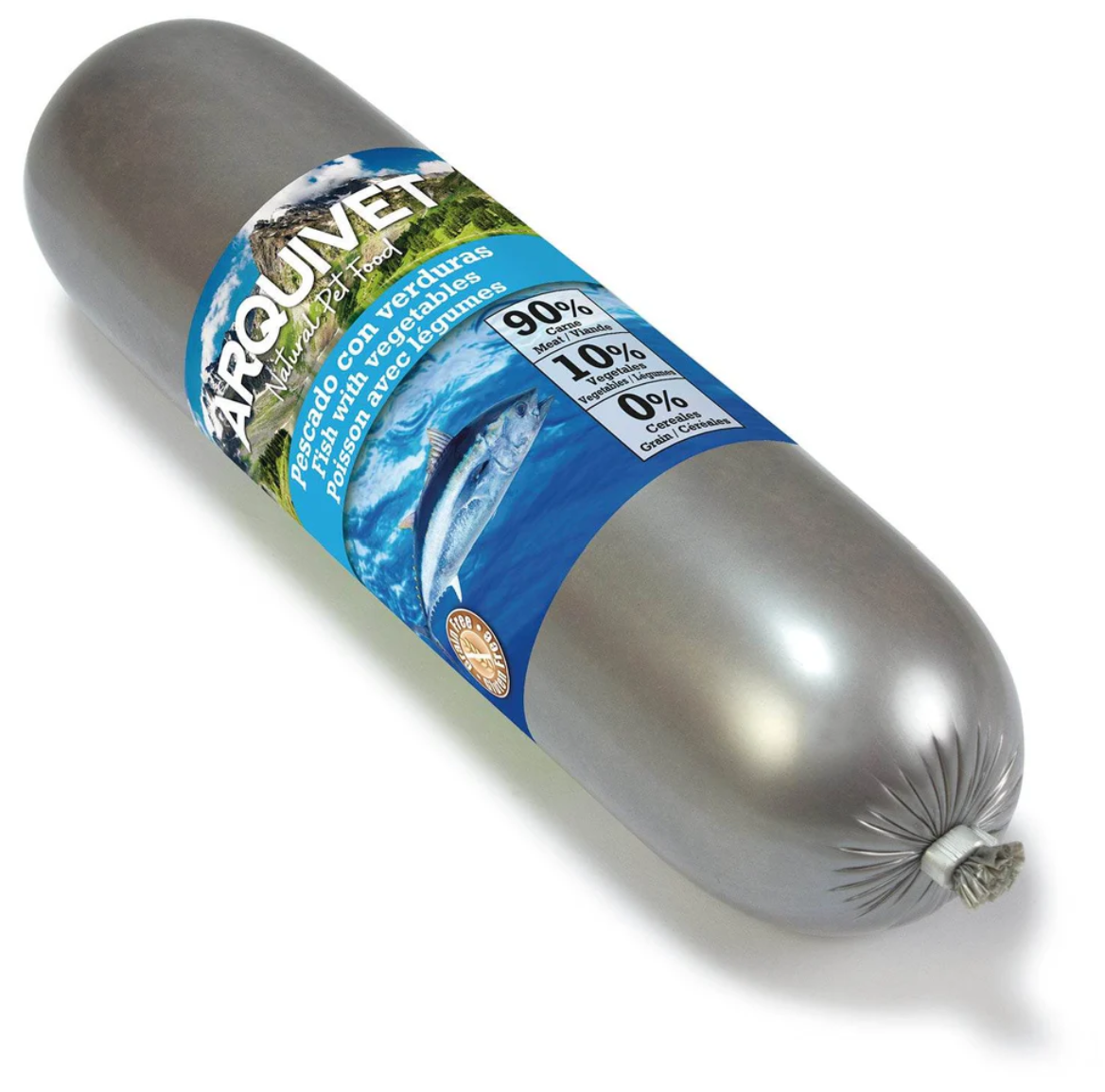 Fish sausage with vegetables. A highly palatable complete food for all types of dogs, promoting a healthy metabolism. 90% meat. 10% vegetables. Grain and gluten free. Provides all the energy and vitality your dog needs in a tasty and unique way, much closer to human nutrition.