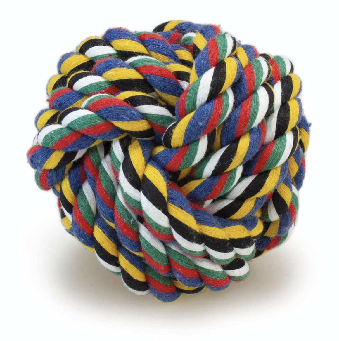 A knotted cotton ball made from colorful braided rope. Helps keep your dog's teeth and gums clean.Measures 10 cm.