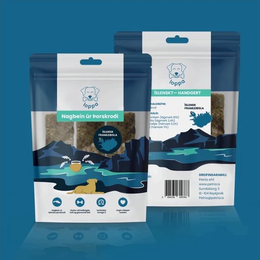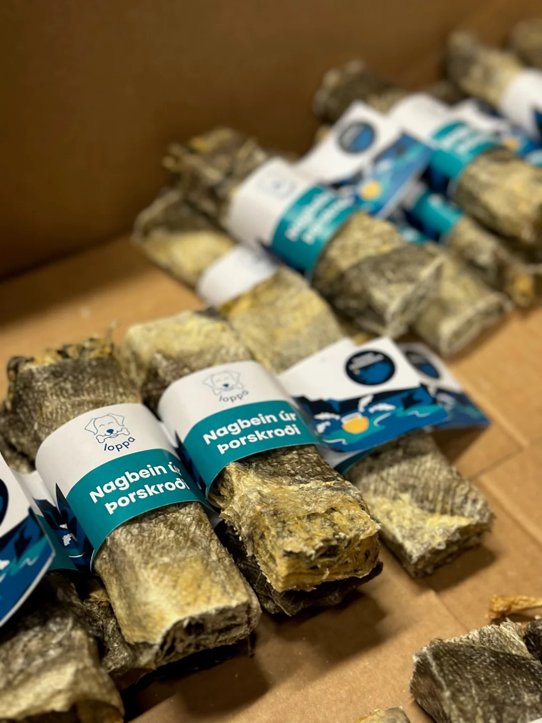 Nagbein úr íslensku þorskroði frá vörumerkinu Loppa er íslenskst og handgert. Nagbeinin eru ljúffeng á bragðið og er þorksroð eina innihaldsefnið. Nagbeinin eru tilvalin til að fá þinn besta vin til að „dunda“ sér við að naga þorskroðið í dágóða stund og það er einnig gott fyrir tennurnar til að koma í veg fyrir uppsöfnun tannsteins.