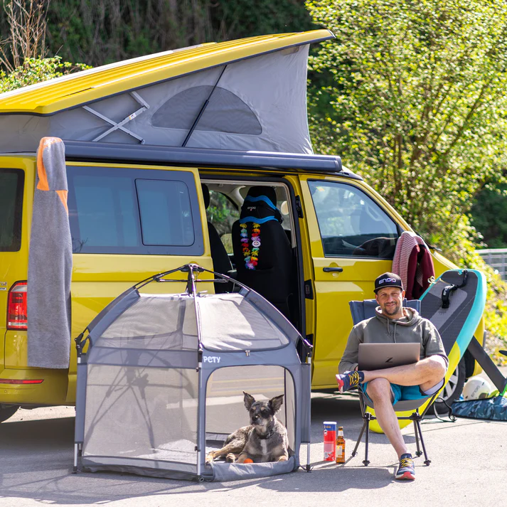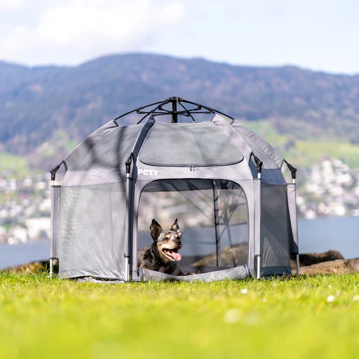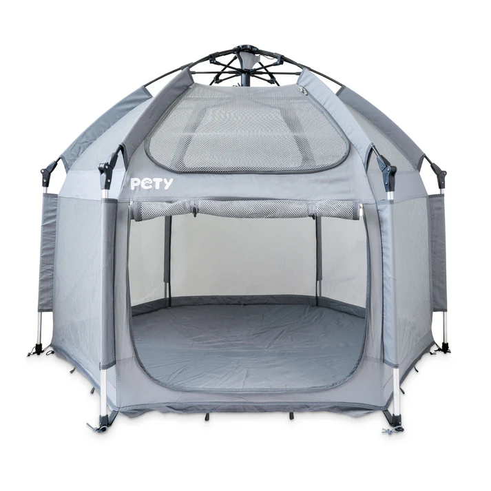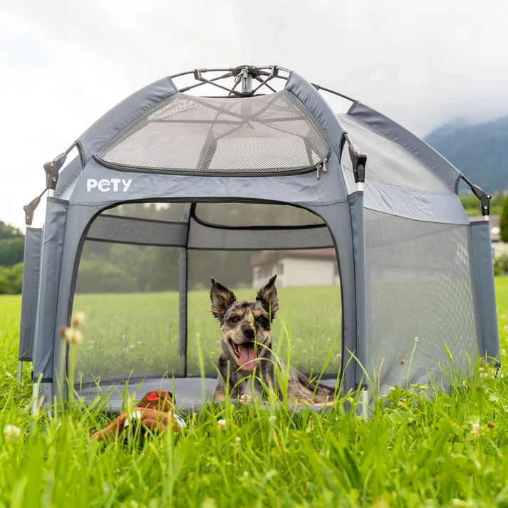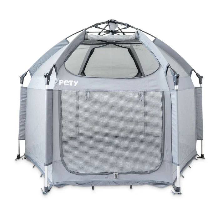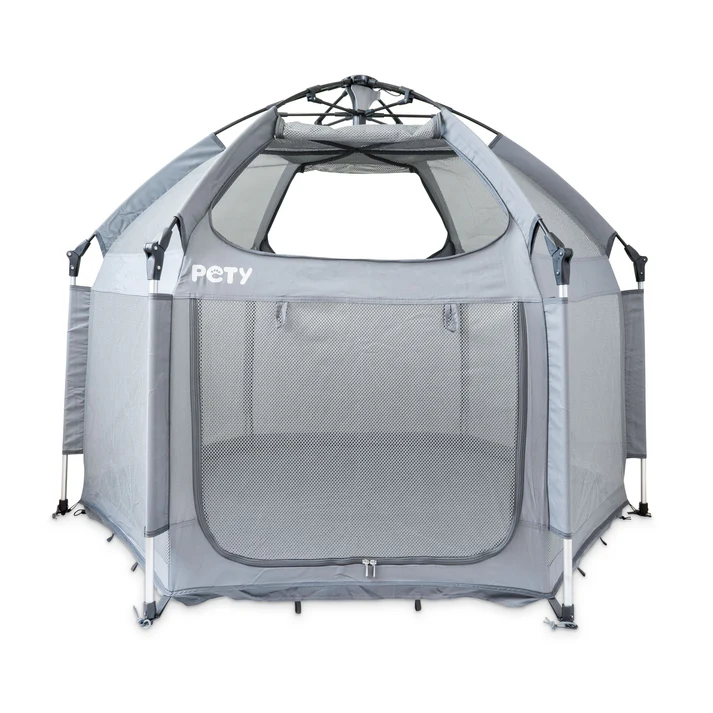 Nýr uppáhaldsstaður hundsins þíns. PETY leikgrind/búr fyrir hunda er sett upp og sett saman aftur á nokkrum sekúndum. PETY grindin er einnig tilvalin fyrir ferðalög eða hundasýningar þökk sé hve fislétt og fyrirferðalítil hún er samanbrotin. Það er hágæða loftræsting í gegnum netveggina á PETY og þú hefur hundinn þinn alltaf í augnsýn.