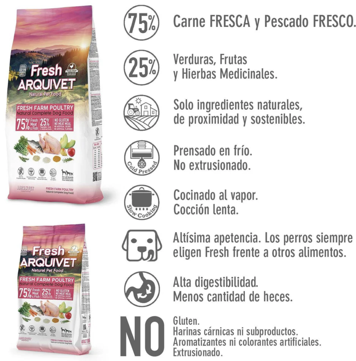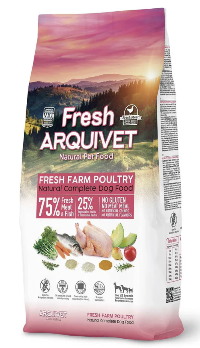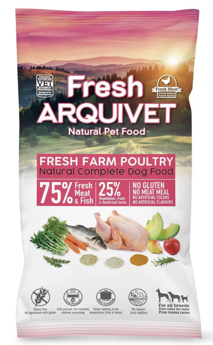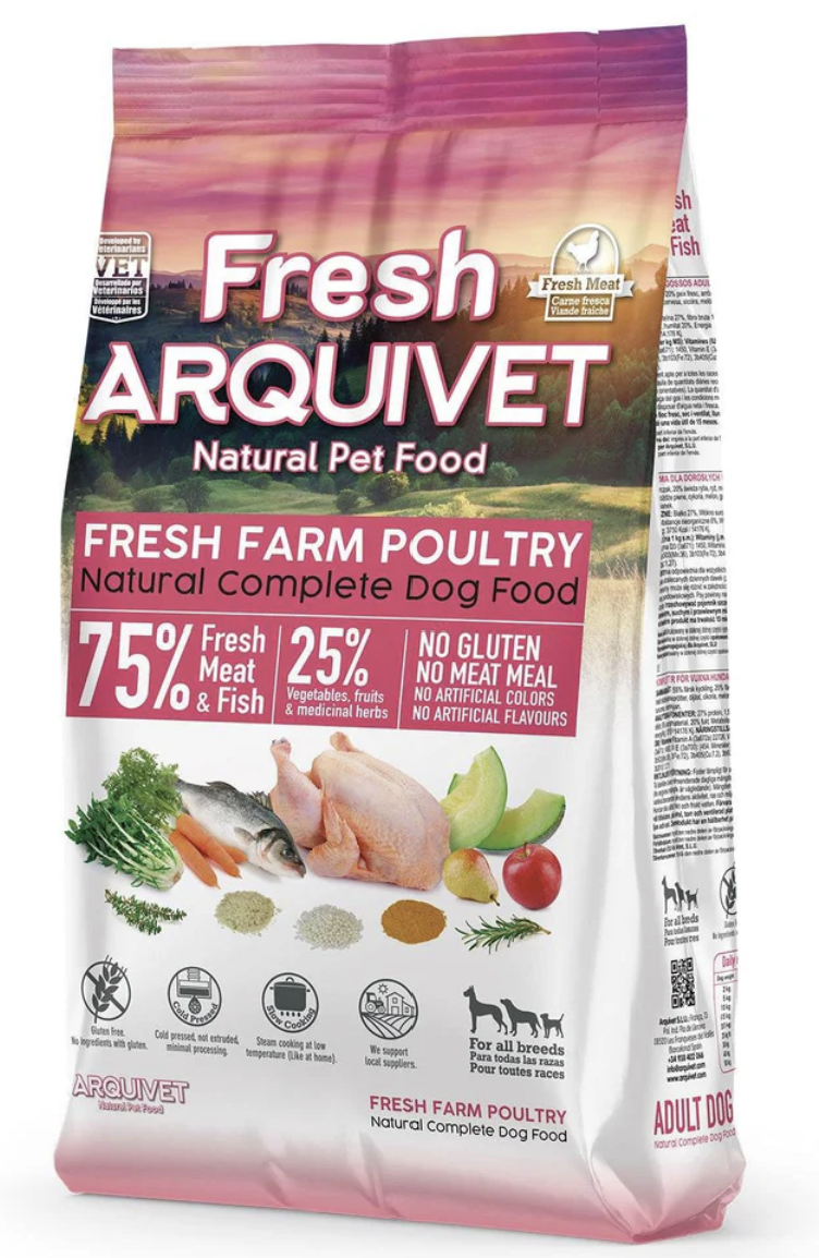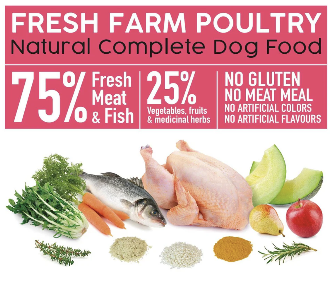 Complete semi-moist food for all types of adult dogs, with 55% fresh chicken, 20% fish, and 25% vegetables, fruits, and medicinal herbs. Cold-pressed, not extruded, minimally processed. With 100% natural ingredients, gluten-free, no meat flours, no artificial colors or flavors. Slow-cooked at a low temperature.