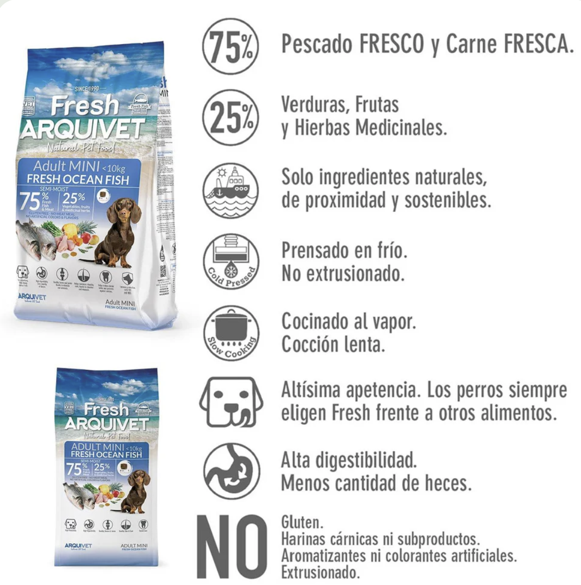 Complete semi-moist food for MINI or small breed dogs , with 55% fresh fish, 20% fresh chicken, and 25% vegetables, fruits, and medicinal herbs. Cold-pressed, not extruded, minimally processed. With 100% natural ingredients, gluten-free, no meat flours, no artificial colors or flavors. Slow-cooked at a low temperature.
