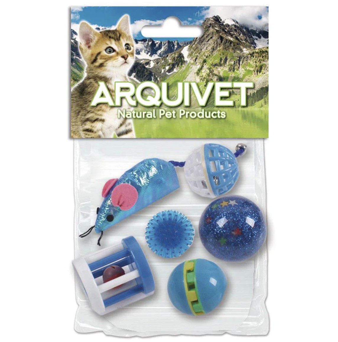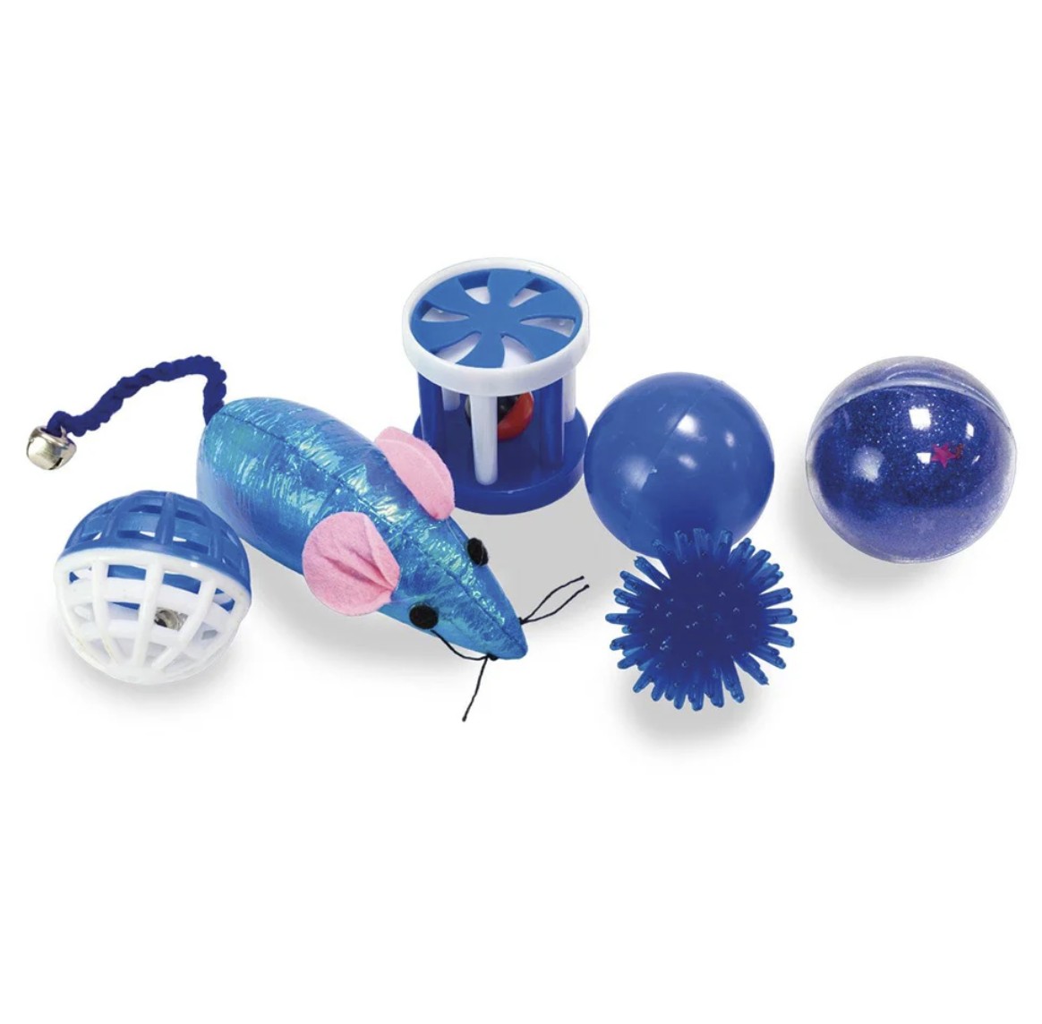Lítil blá kattaleikföng. Poki með 6 mismunandi hlutum.