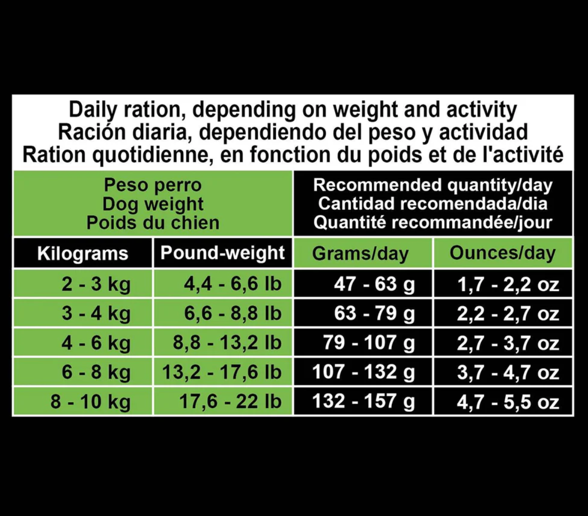 HOW TO USE: Feed the daily ration, preferably divided into 2 or 3 doses per day, and always at the same times. The amount of food may vary depending on the dog's activity, breed, and environmental conditions.