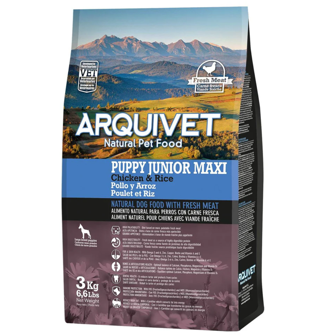 With larger kibbles appropriate for this breed. This food has been specially formulated to provide puppies with a moderate level of fat, helping them maintain a healthy weight and thus maintain joint health. Thanks to the fresh protein content, the development of strong muscles and bones is improved. The vitamin-mineral balance of Puppy Junior Maxi strengthens the immune system, promoting the protective barriers of the skin, hair and mucous membranes.